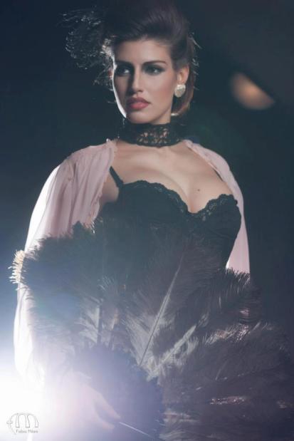 INTIMO D’EPOCA – allestimento set “burlesque” » ventaglio da teatro in piume di struzzo con gancio a fiocco per agganciare alla cintura – bacchette in tartaruga; bustino anni 40 pizzo-merletto a fondo “punto principesse”, guarniture de lingerie in seta brodè nero; al collo merletto fine 800 “dentelle macramè” denominata collaretta strozzacollo; vestaglia in voille en tulle rosa antico – bordure e laccetti in velluto nero rifinito con ricamo a mano punto smok