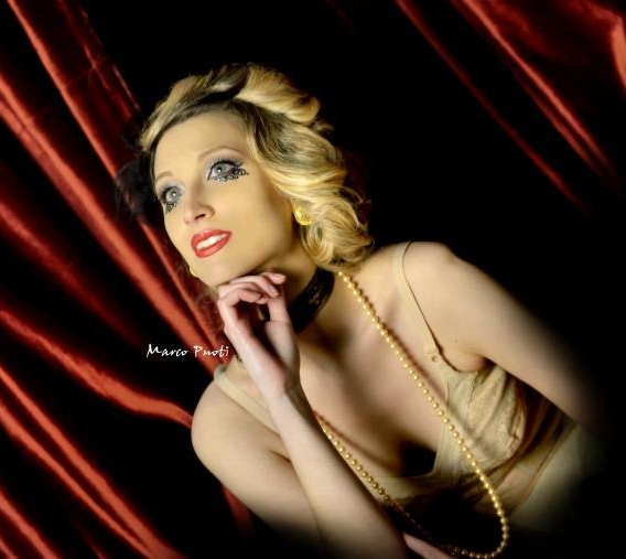INTIMO D’EPOCA – allestimento set “burlesque” » atteggiamento burlesque humor – bustino 1940 color carne motivi floreali broderie con nuances chiaro/scuro tutto brodè con giarrettiera in seta popeline