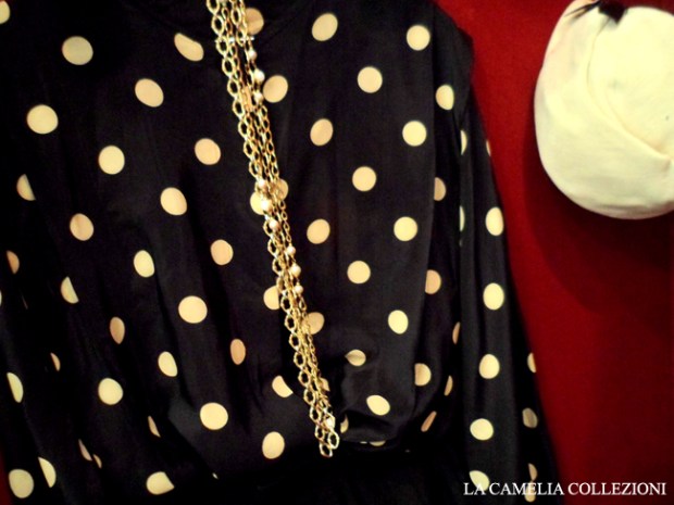 Vestiti femminili accessoriati » vestiti a pois – blusa in seta manica lunga nera con pois panna abbinata a gonna a pieghe nera – la camelia collezioni