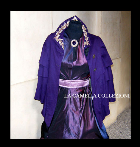 VESTITI ANTICHI E ACCESSORI » vestito da gran galà gran sera viola vinaccia cangiante con mantellina fine 800 – moda femminile 1800 – la camelia collezioni