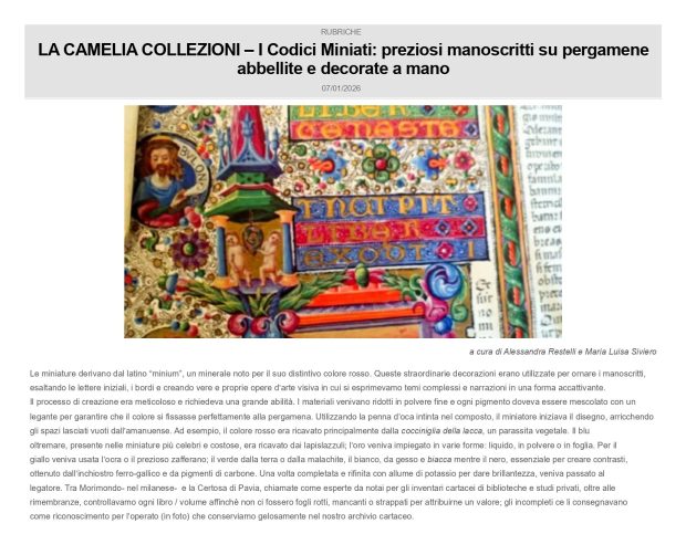 Questa settimana il tema della nostra rubrica ( n. 01 /2026 ) sul giornale ” La Lomellina” è dedicato ai Codici Miniati, vere e proprie opere d’arte medievali nate dalla pazienza di amanuensi e miniatori; un linguaggio visivo complesso creato per istruire e meravigliare chi non sapeva leggere. Prima della stampa infatti, i libri venivano scritti e dipinti a mano su pergamena.