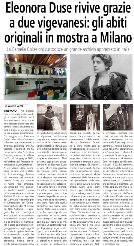 “𝑰𝒏 𝑽𝒊𝒂𝒈𝒈𝒊𝒐 𝒄𝒐𝒏 𝑬𝒍𝒆𝒐𝒏𝒐𝒓𝒂 𝑫𝒖𝒔𝒆” – Un ringraziamento speciale al giornalista Valerio Vecchi per questo articolo su “La Lomellina” che esprime appieno il nostro impegno costante nel diffondere cultura e nel custodire quello che è parte della nostra storia; un omaggio significativo a una delle tante tappe che ci vede partecipi come partner gemellate al progetto scientifico internazionale “Duse Centenario” e che proseguirà per tutto il 2025. “