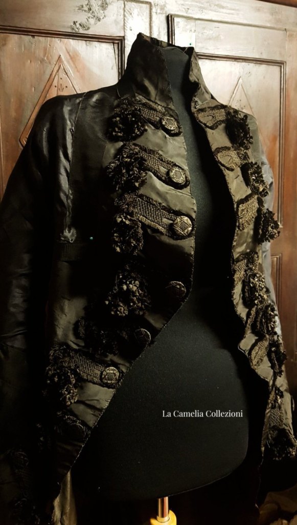 Manutenzione su marsina del 700 con ricostruzione e assestamento lacerazioni; la conservazione dei manufatti antichi richiede una particolare attenzione e se non viene fatta nel modo corretto provoca rotture nel tessuto