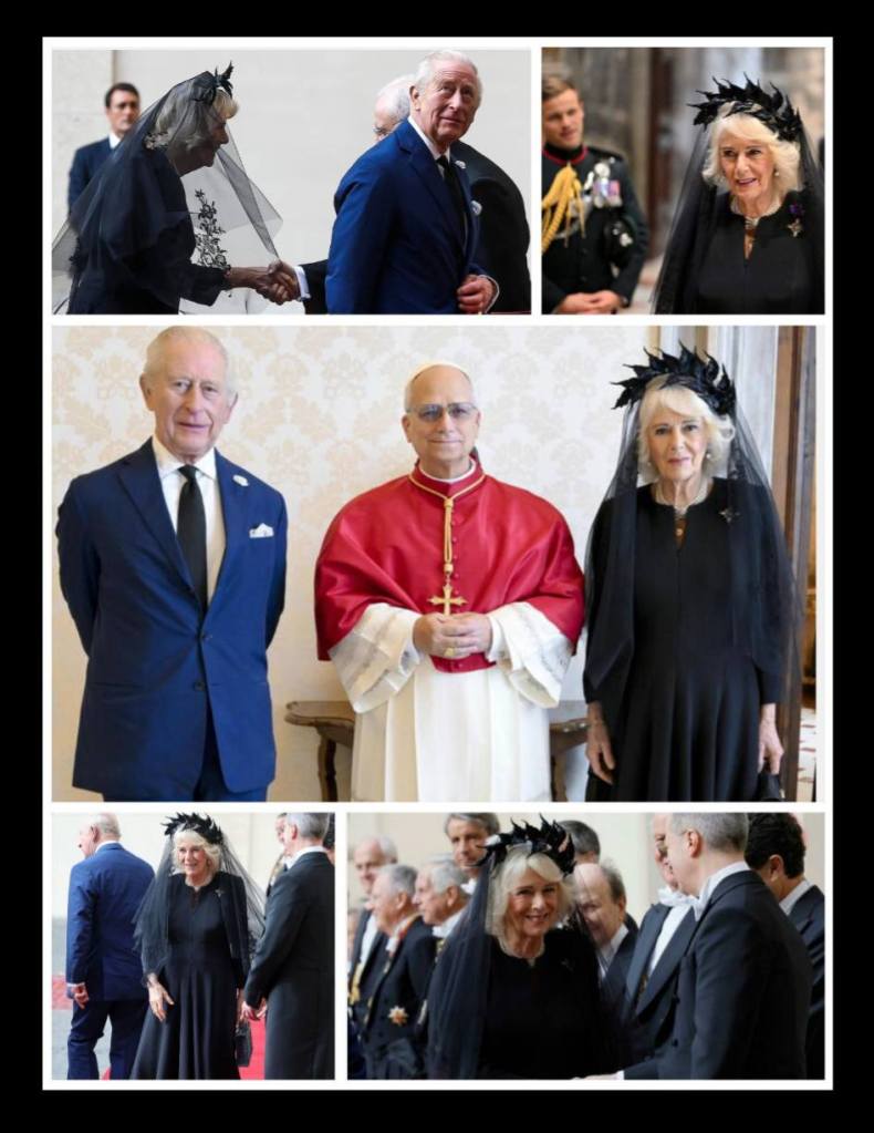 Oggi un evento storico e di rilevanza istituzionale quello dell’udienza di Re Carlo III con la Regina Camilla che ha interpretato con eleganza il protocollo vaticano presenziando con un velo-mantiglia nero (con intarsi applicazione pizzo Bruxelles detto Inghilterra/merletto a fuselli a pezzi riportati) davanti a Papa Leone XIV.