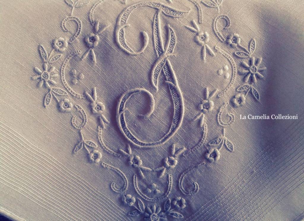 particolare di raffinato fazzoletto fine secolo 800 con monogramma ricamato a punto pieno imbottito e punto sabbia