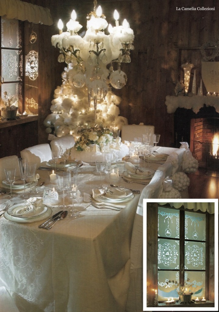 La neve cade sulle composizioni di foglie secche, bacche e pigne che si illuminano di candele appoggiate sui davanzali interni. Alle finestre tendine di gusto alsaziano ad intaglio. Decine di lucine romantiche e il centrotavola dove sbucano fiori freschi si appoggia sulla tavola bianca in lino a ricordare la distesa di neve immacolata. Un runner di velo con ricami effetto rilievo e attorno, sulle sedie vestite, sono appese morbide palle di batuffoli.